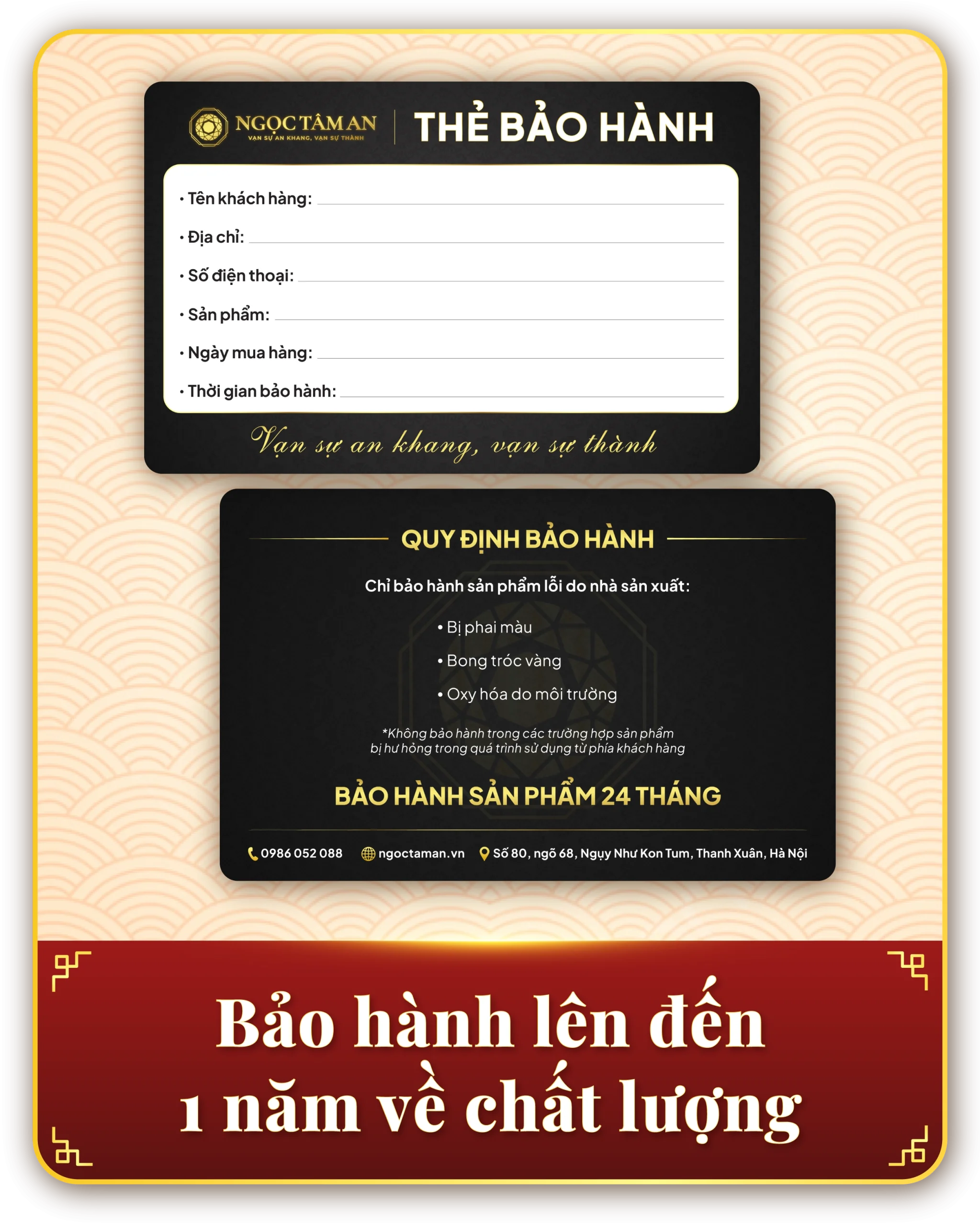 Trong tháng này, Ngọc Tâm An đang triển khai chương trình khuyến mại nhân dịp tết Nguyên Đán, mang đến cho bạn những món quà mạ vàng tinh xảo với ưu đãi hấp dẫn đặc biệt. Chúng tôi cam kết giao hàng nhanh chóng và miễn phí trên toàn quốc, mang đến sự tiện lợi và hài lòng cho khách hàng.